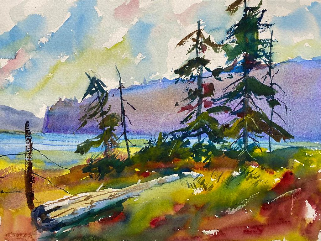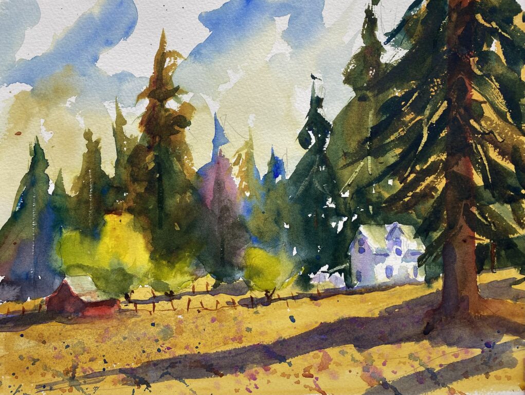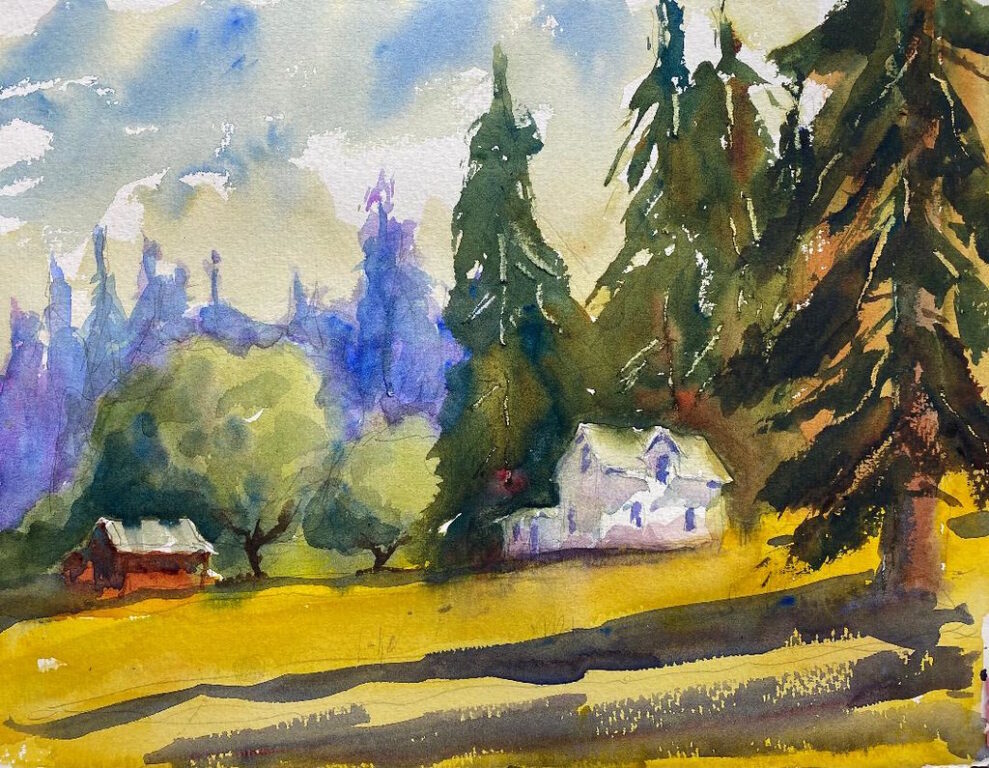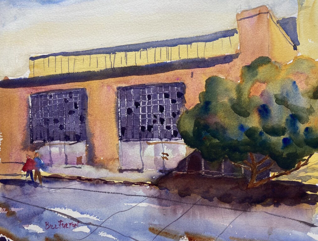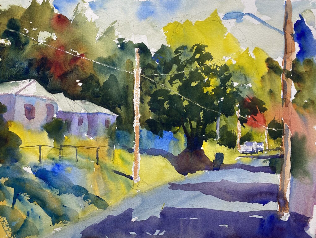 I liked the grittiness of the scene with the broken windows, so I tried to capture it in a watercolor. I like the color of the walls and the windows, but I struggled to paint the tree and its beautiful shadow. But all in all, I’m pretty satisfied with this painting.